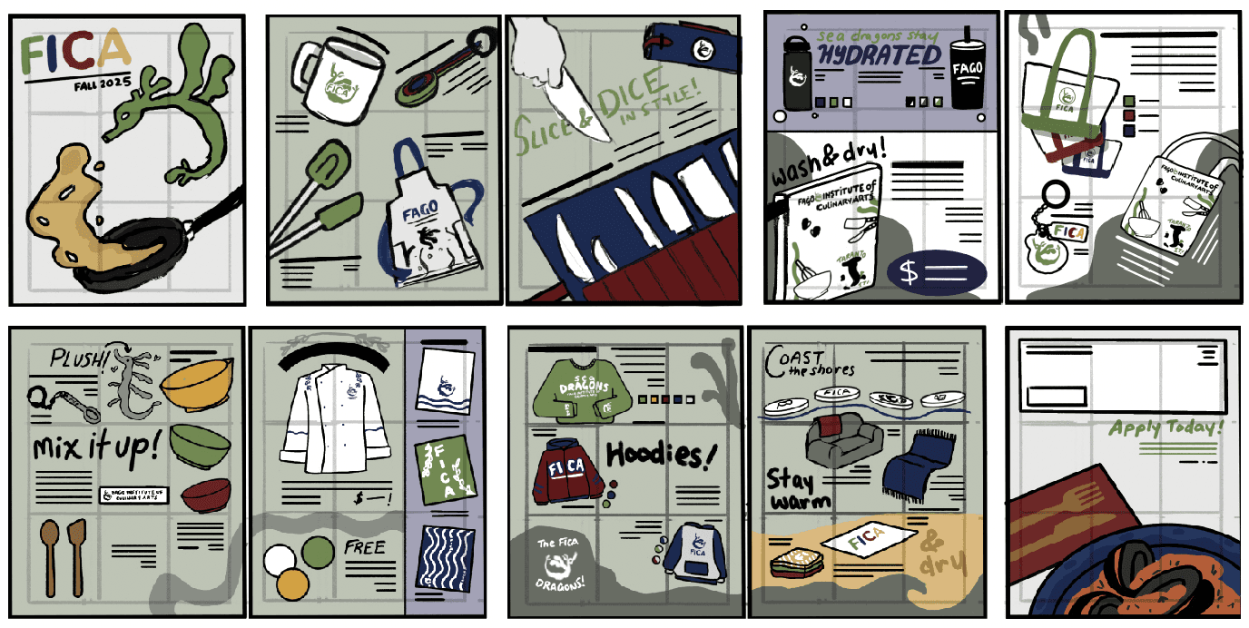 > To achieve a dynamic catalog that represents the school and brand, rounds of sketches were completed. This stage developed the ideation for unique layouts to showcase the assorted apparel and school merchandise. There was a heavy emphasis on choosing a grid structure to keep the catalog consistent and readable for students, their families, and others who have no previous experience or knowledge of the school.